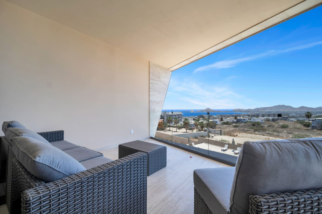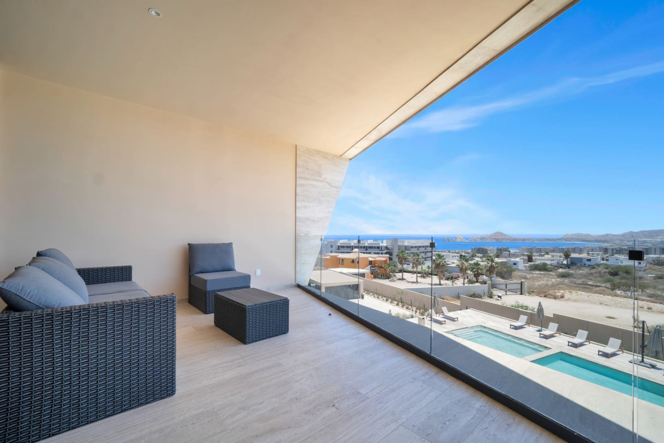 This condo is on the third floor and offers unblocked views of the famous Cabo Arch, the Sea of Cortes, the famous Medano Beach and much more. The Master bedroom also enjoys a spectacular view of the Cabo Arch and Sea of Cortez. Each of the three bedrooms have their own private ensuite bathroom. The open concept condo offers a spacious layout and a large kitchen with a peninsula breakfast bar. The indoor living space opens up to a very large outdoor terrace for you to enjoy the amazing Cabo weather. There are lots of amenities, including multiple ocean view pools, jacuzzi's, fully equipped gym, and indoor and outdoor lounges.