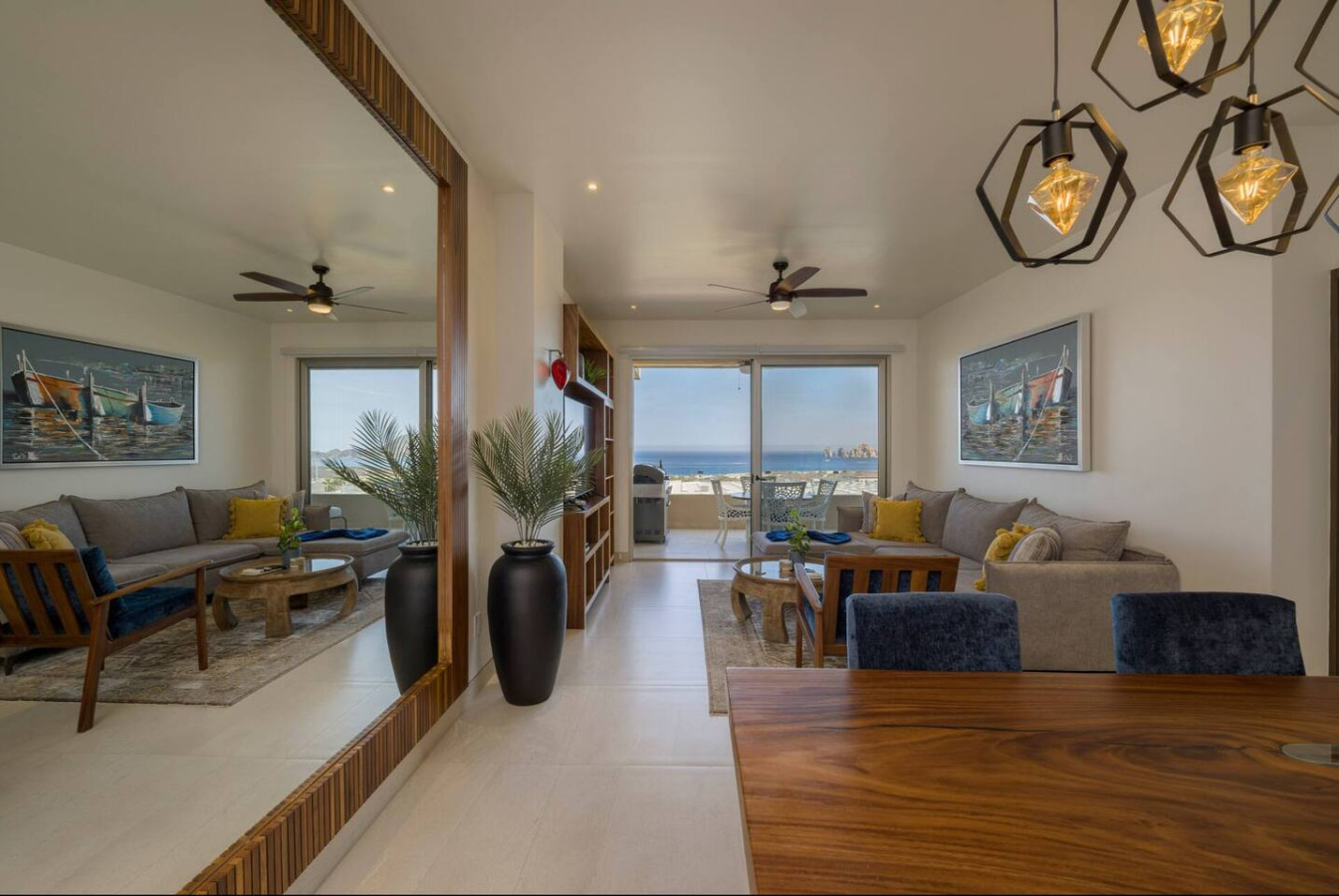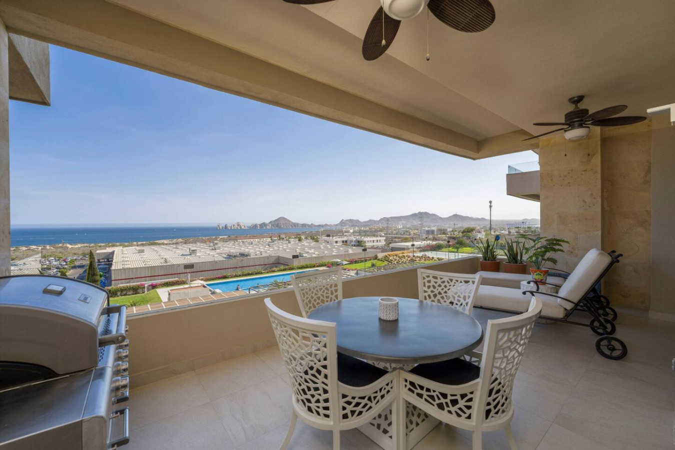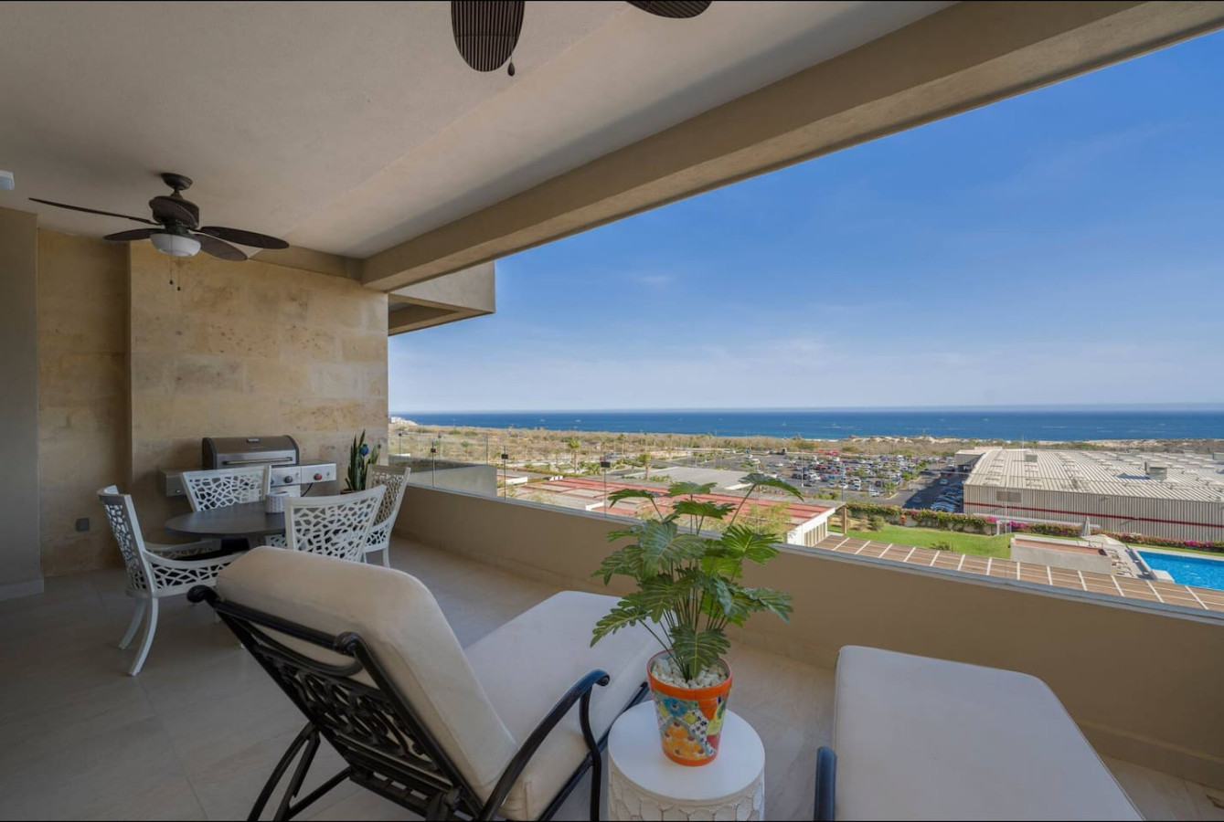 Beautiful 2 bedroom corner unit with the most amazing views of the Sea of Cortez and Arch of Cabo San Lucas from the living room, master bedroom and lovely terrace. This extraordinary condo has 2 bedrooms with en-suite bathrooms, 1/2 bath powder room, walk-in closets, laundry closet, open living room, custom kitchen including upgraded granite as well as upgraded appliances and kitchen sink and one parking space if you choose to rent a car. It is fully furnished, equipped and ready for your stay. Vista Vela II is a private community with 24/7 security, 4 pools, gym, playroom, club house, BBQ area, tennis and pickle ball courts. With a great location and superb amenities this community is one of the most desired vacation rental developments in all of Cabo.