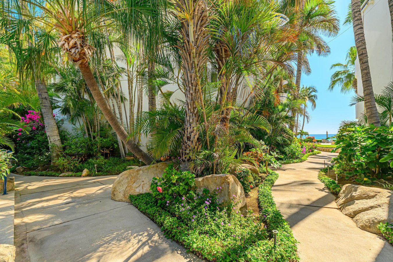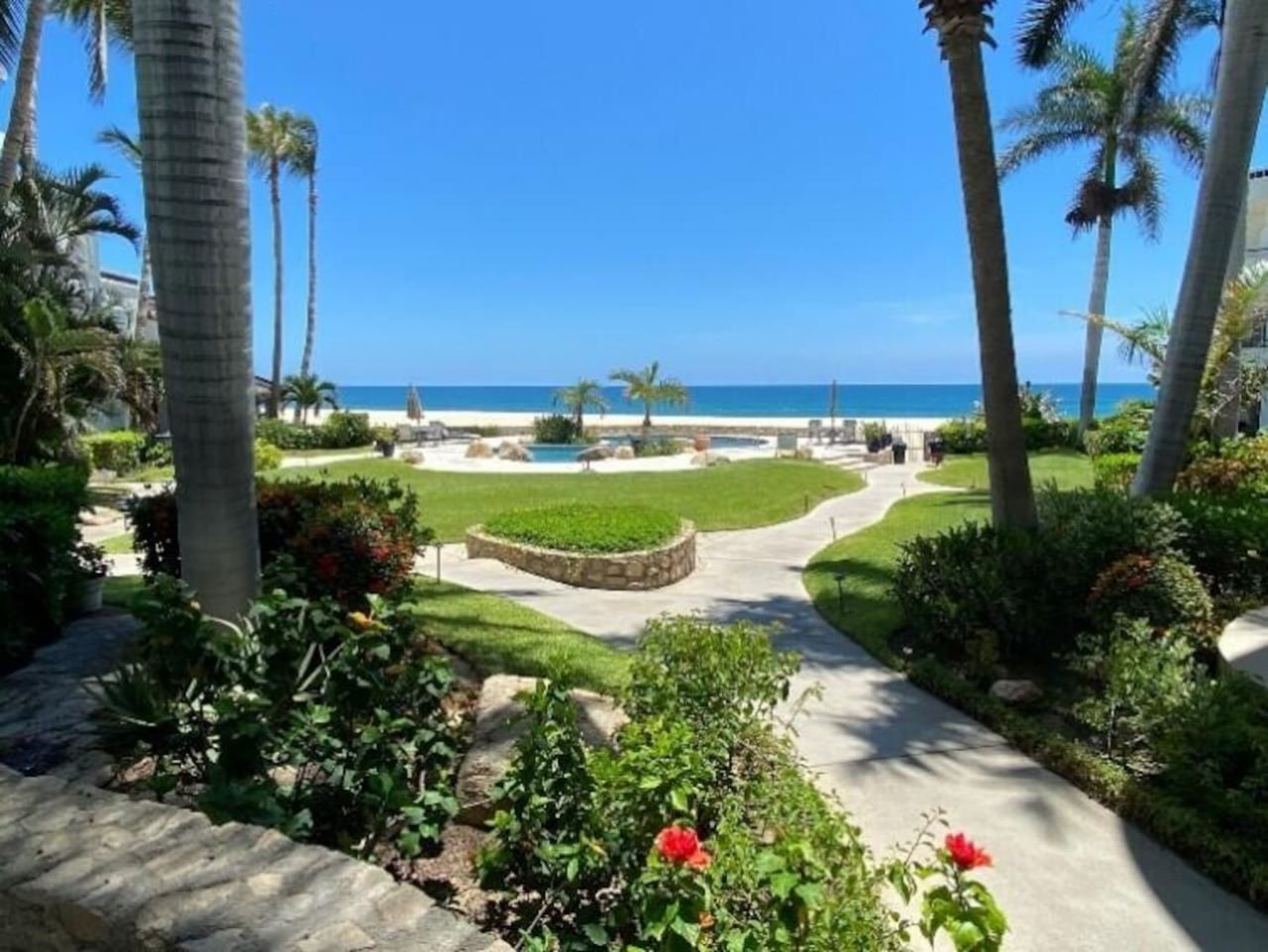 When you arrive you walk a short cobblestone path through lush plantings with orchids and staghorn ferns, take one easy set of stairs and you’re in a perfect 2nd floor condo unit with a view that has it all…...beautifully landscaped grounds, tall palms, artistically designed heated pool and immediately past this all the sand, surf and ocean one could want! Imagine only 25 steps from the building to the pool, 5 more to the beach and who counts after that.