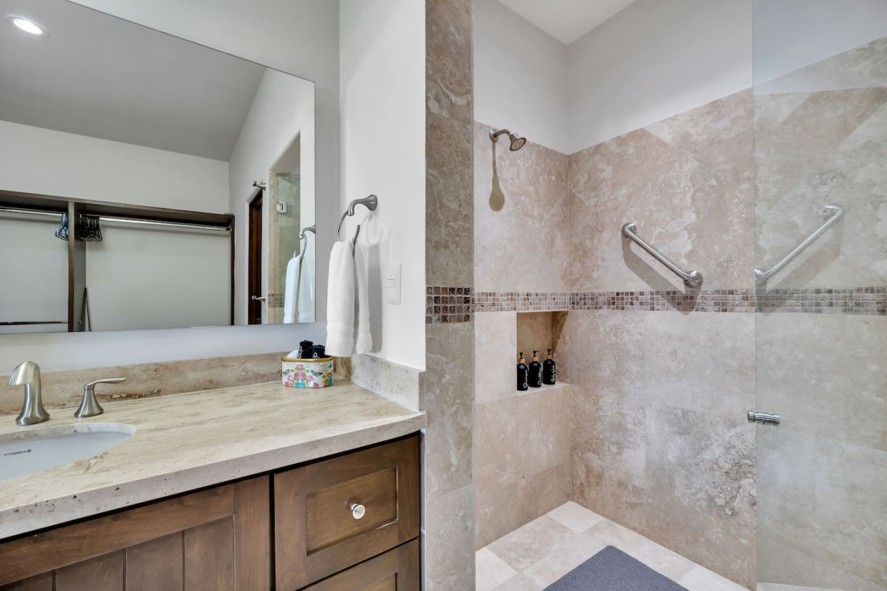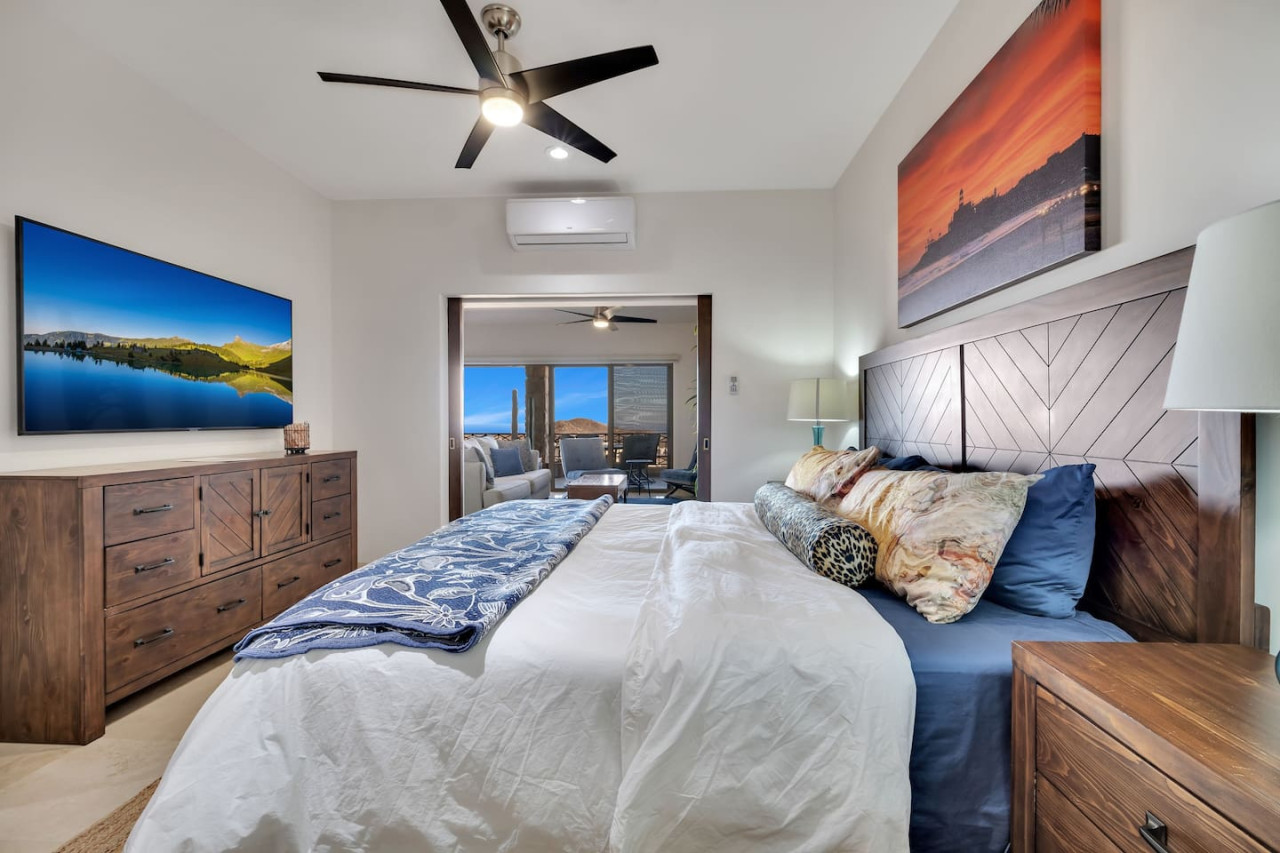 Relax with friends/family in a peaceful neighborhood at the top of El Tezal with unblocked views. A perfect condo for a week, a month or a season! No car, no problem. This location gives you the best of both worlds…a peaceful morning sunrise for coffee-time, watch the cruise ships come and go from the marina, listen to the crickets at dusk, enjoy sunset skies over Land’s End and city lights when dark, not to mention the mountains to the east and the entire Sea of Cortez straight ahead.