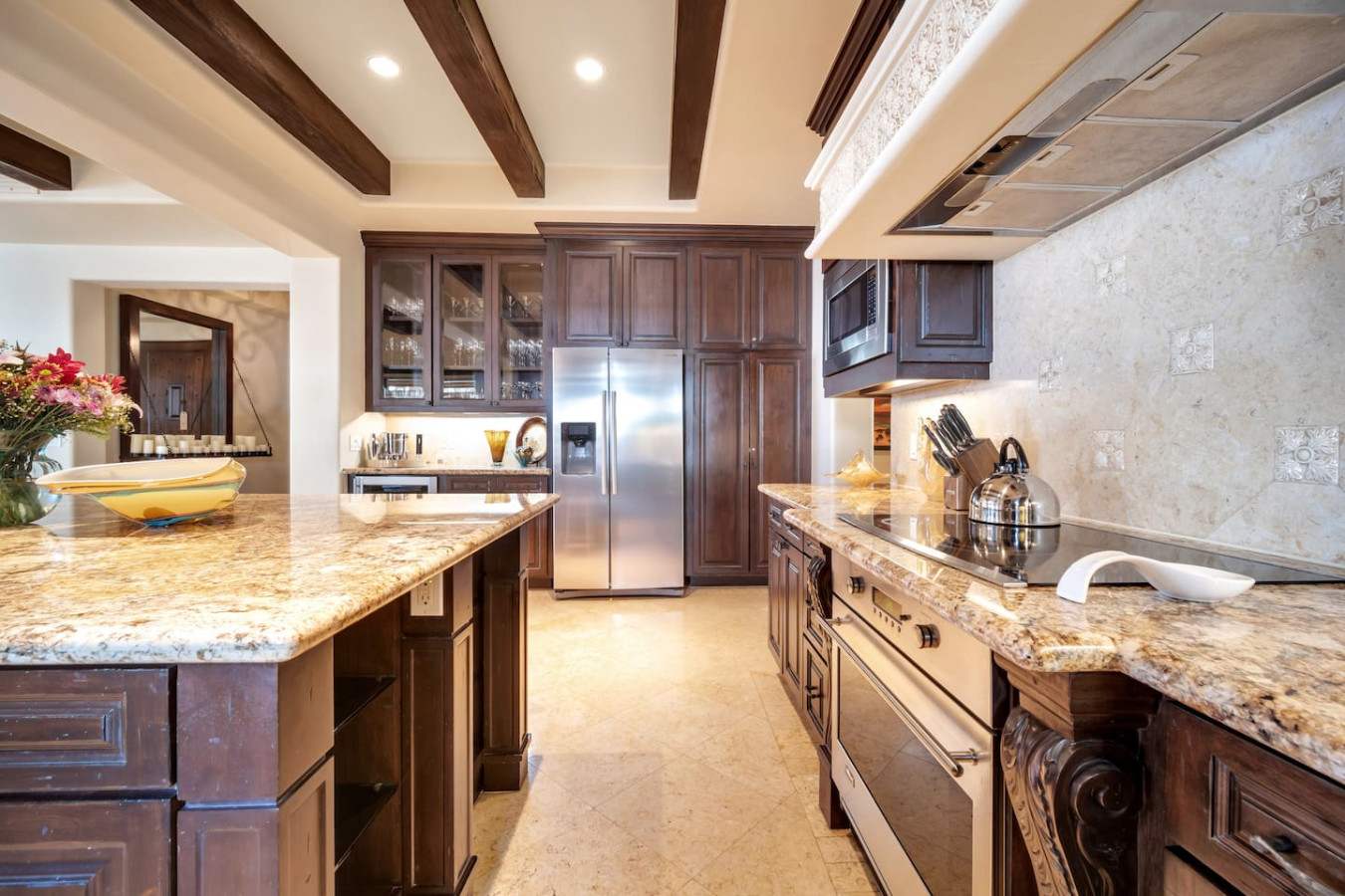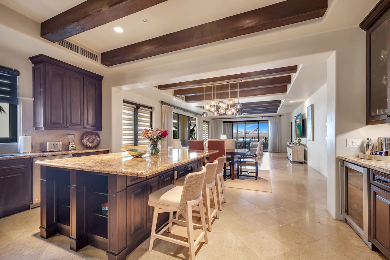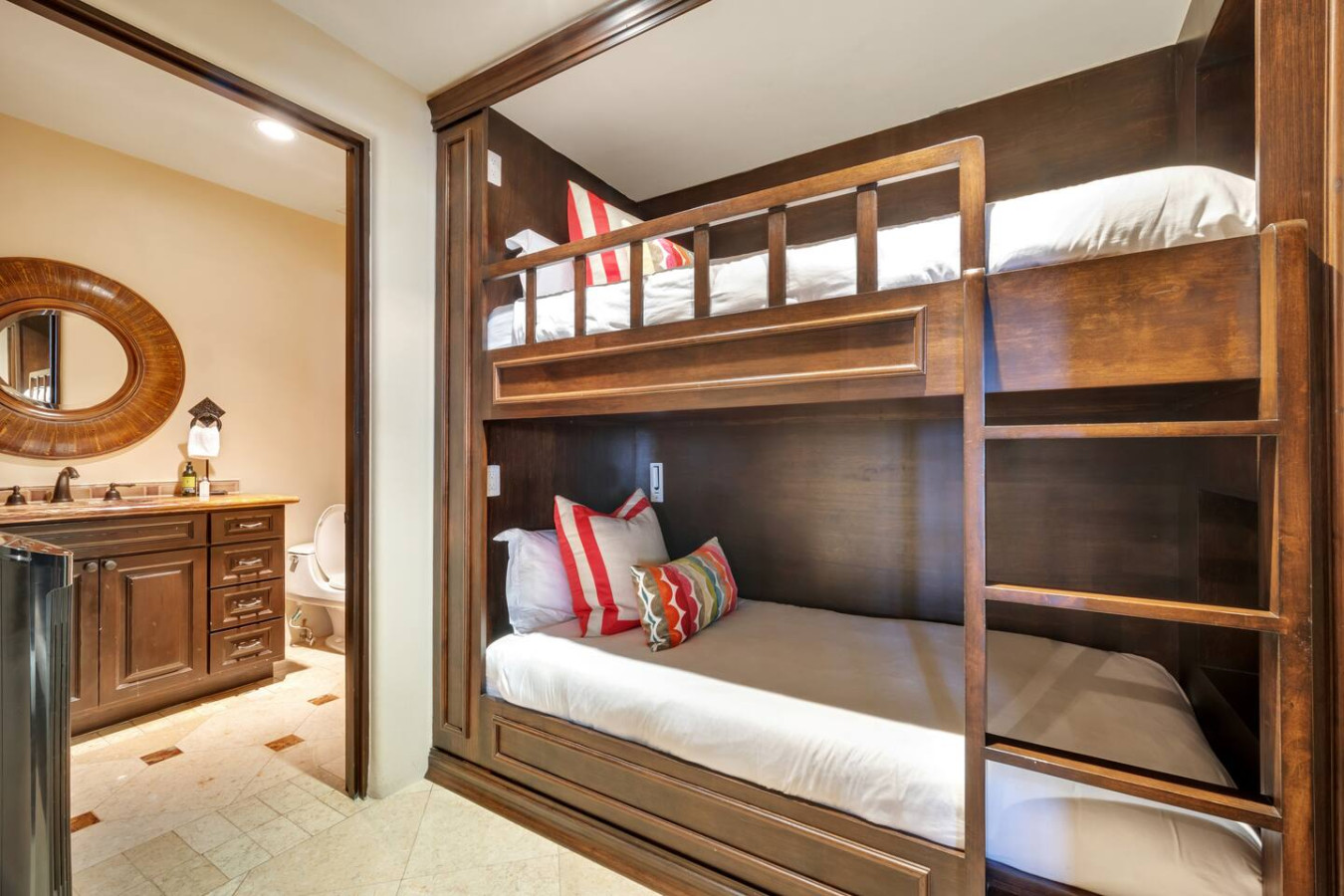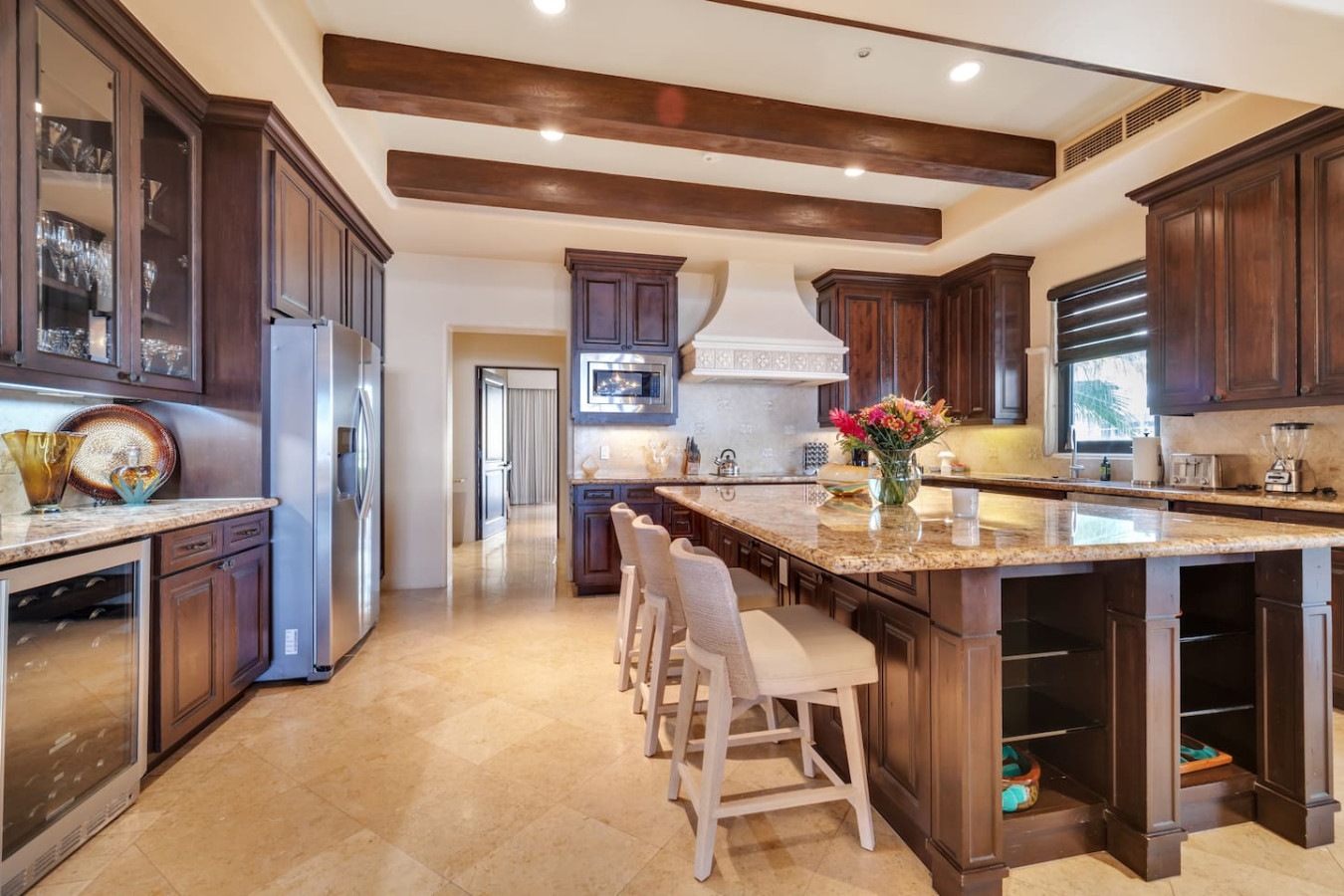 The master and second bedrooms both have luxurious king sized beds. The third bedroom features two elegant queen sized beds. All three bedrooms are complete with ample stone bathrooms and commodious wooden closets. In addition, there is a bunk room near the half bath and entry which allows for two additional guests. The residence can comfortably sleep eight.