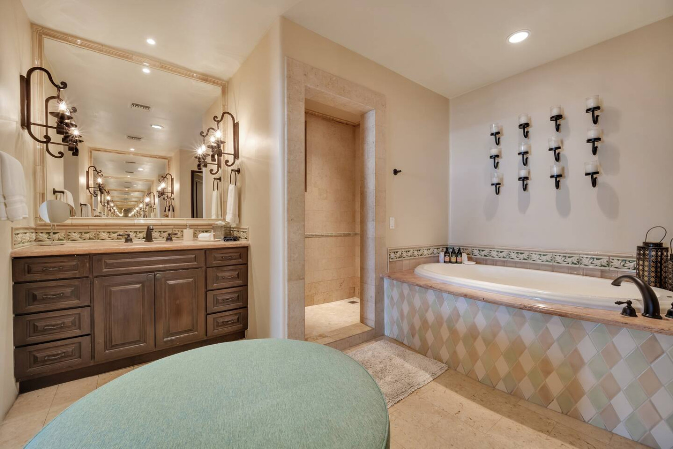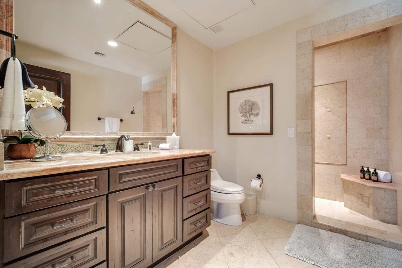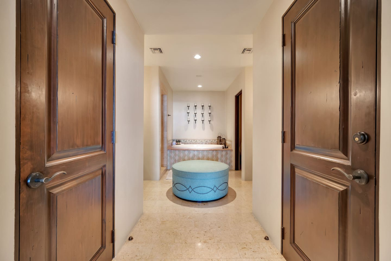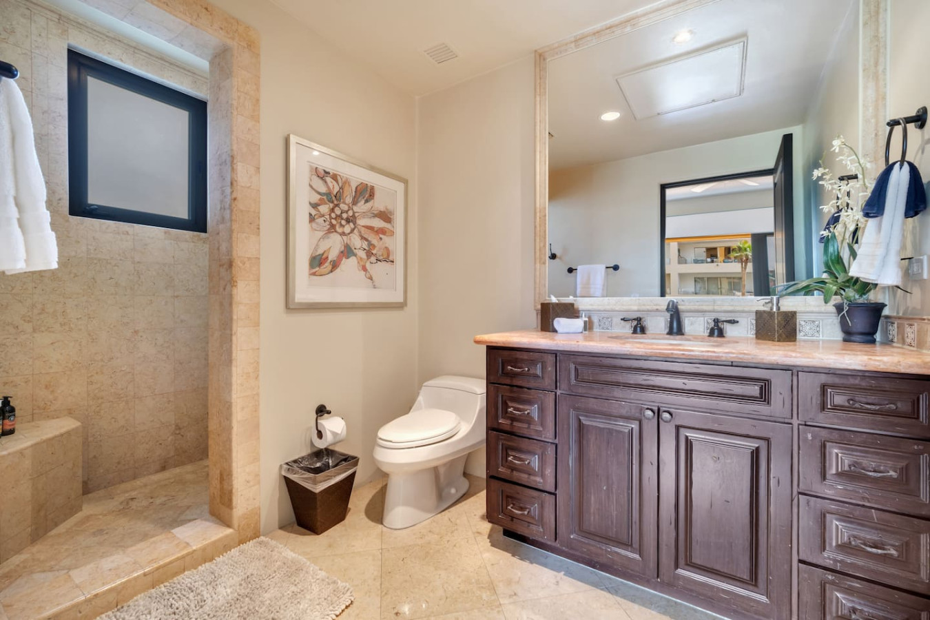 The master and second bedrooms both have luxurious king sized beds. The third bedroom features two elegant queen sized beds. All three bedrooms are complete with ample stone bathrooms and commodious wooden closets. In addition, there is a bunk room near the half bath and entry which allows for two additional guests. The residence can comfortably sleep eight.