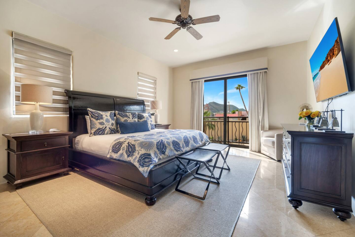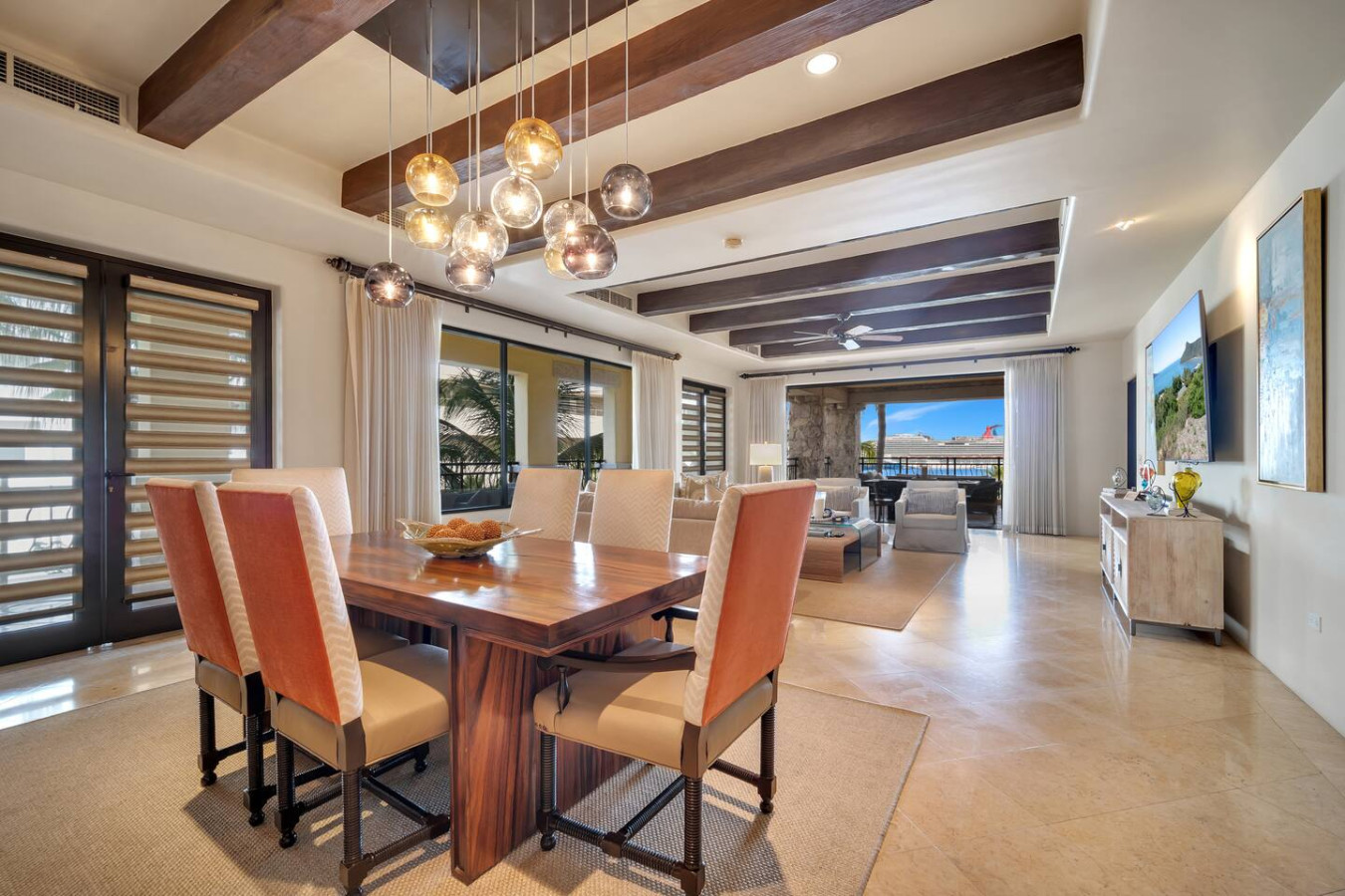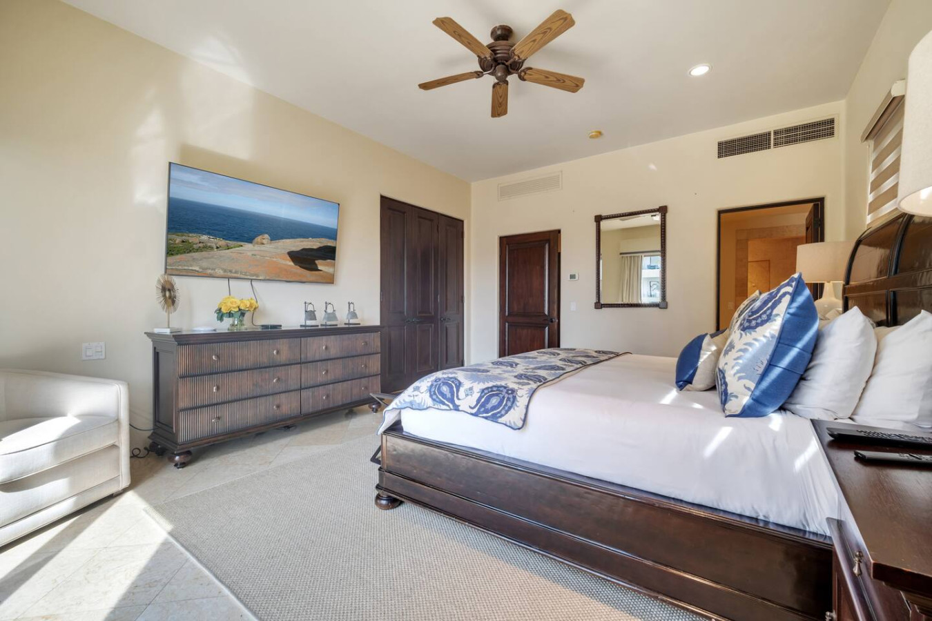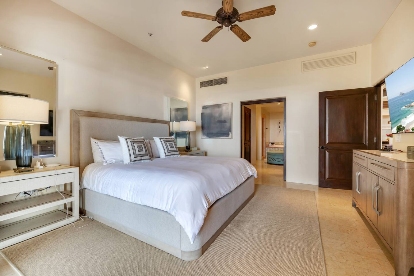 This Villa has a terrace with arresting ocean views. It features lounging and dining areas, ideal for al fresco cocktails or meals. The terrace seamlessly merges with the living room by means of floor-to-ceiling sliding glass doors, resulting in a single, harmonious, ocean breeze-infused space. The living room includes lush, comfortable furniture and an 85” flat screen TV with US satellite programming, complete with a surround sound system with outdoor speakers. There are 60” flat screen televisions in all three bedrooms. High-speed wireless Internet is included.