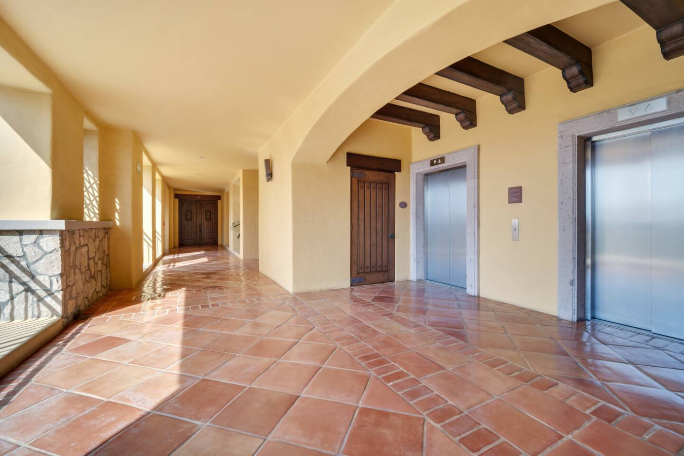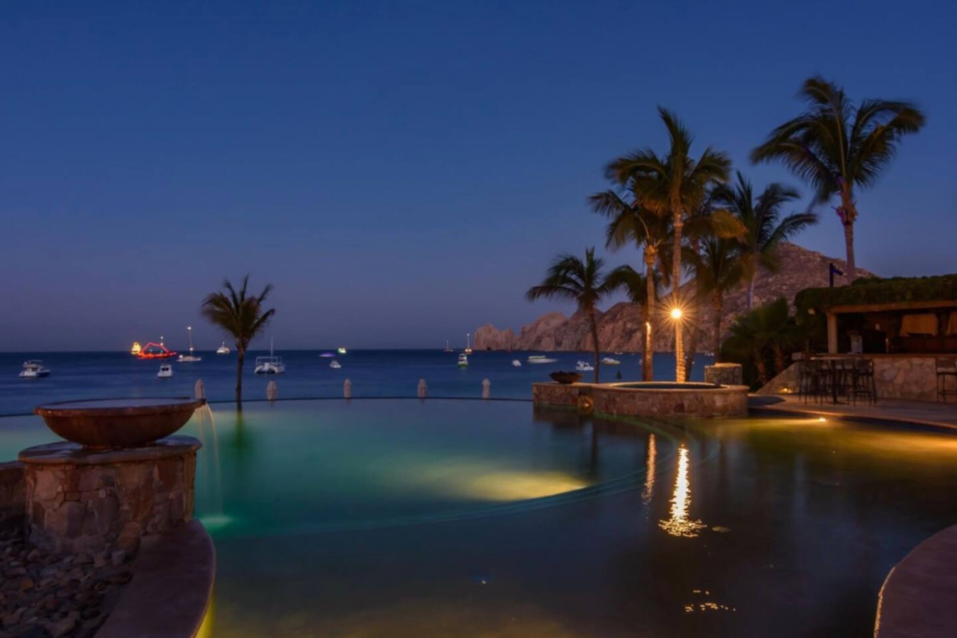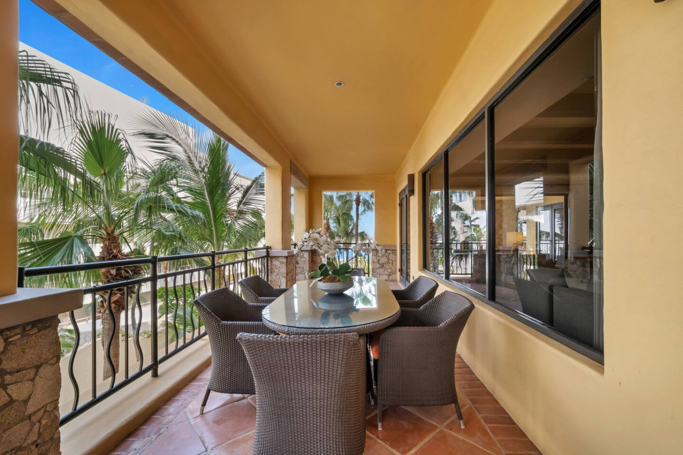 This stately property is located in Hacienda, an exclusive and safe 22-acre gated community a few blocks away from Cabo San Lucas's lively marina, pulsating nightlife, and sophisticated restaurants. The atmosphere inside Hacienda is of a small serene European-style village, featuring hand-hewn stone ledger, Mexican Cantera stone, dark wood accents, and authentic wrought iron detailing.