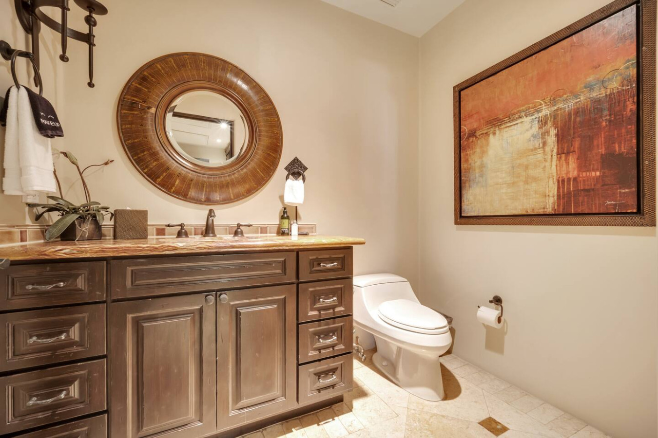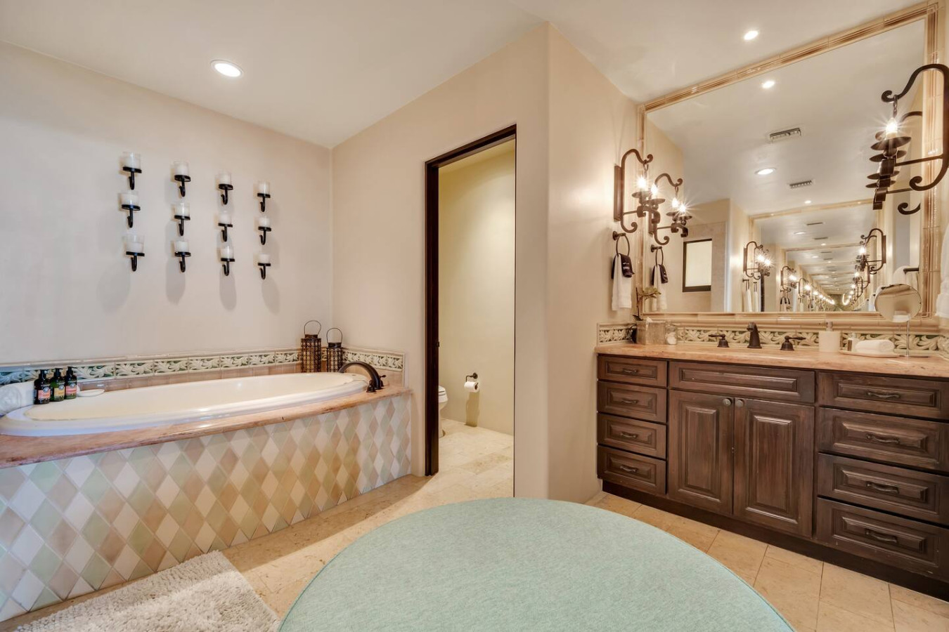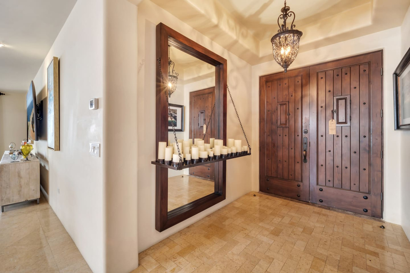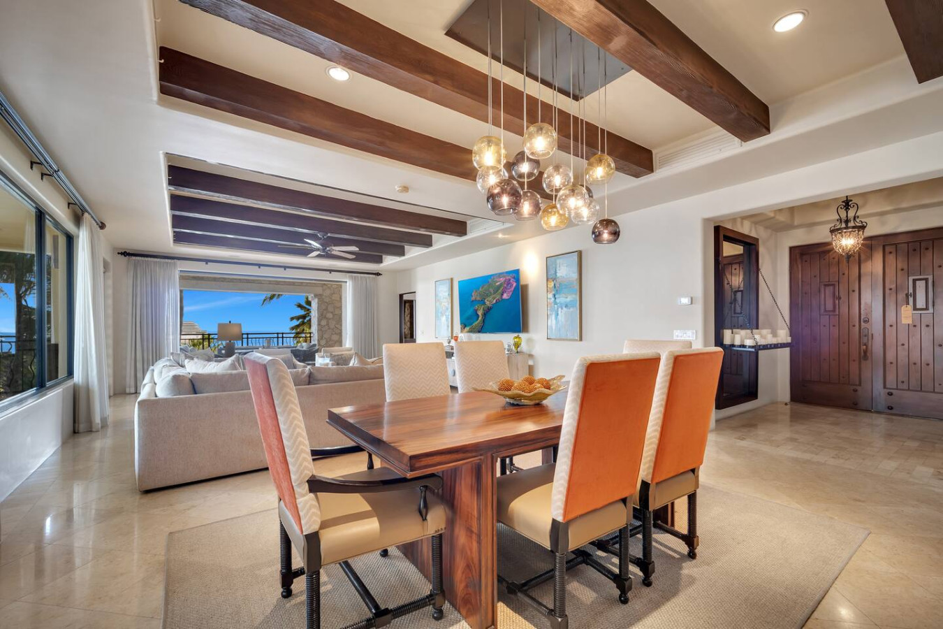 This stately property is located in Hacienda, an exclusive and safe 22-acre gated community a few blocks away from Cabo San Lucas's lively marina, pulsating nightlife, and sophisticated restaurants. The atmosphere inside Hacienda is of a small serene European-style village, featuring hand-hewn stone ledger, Mexican Cantera stone, dark wood accents, and authentic wrought iron detailing.
