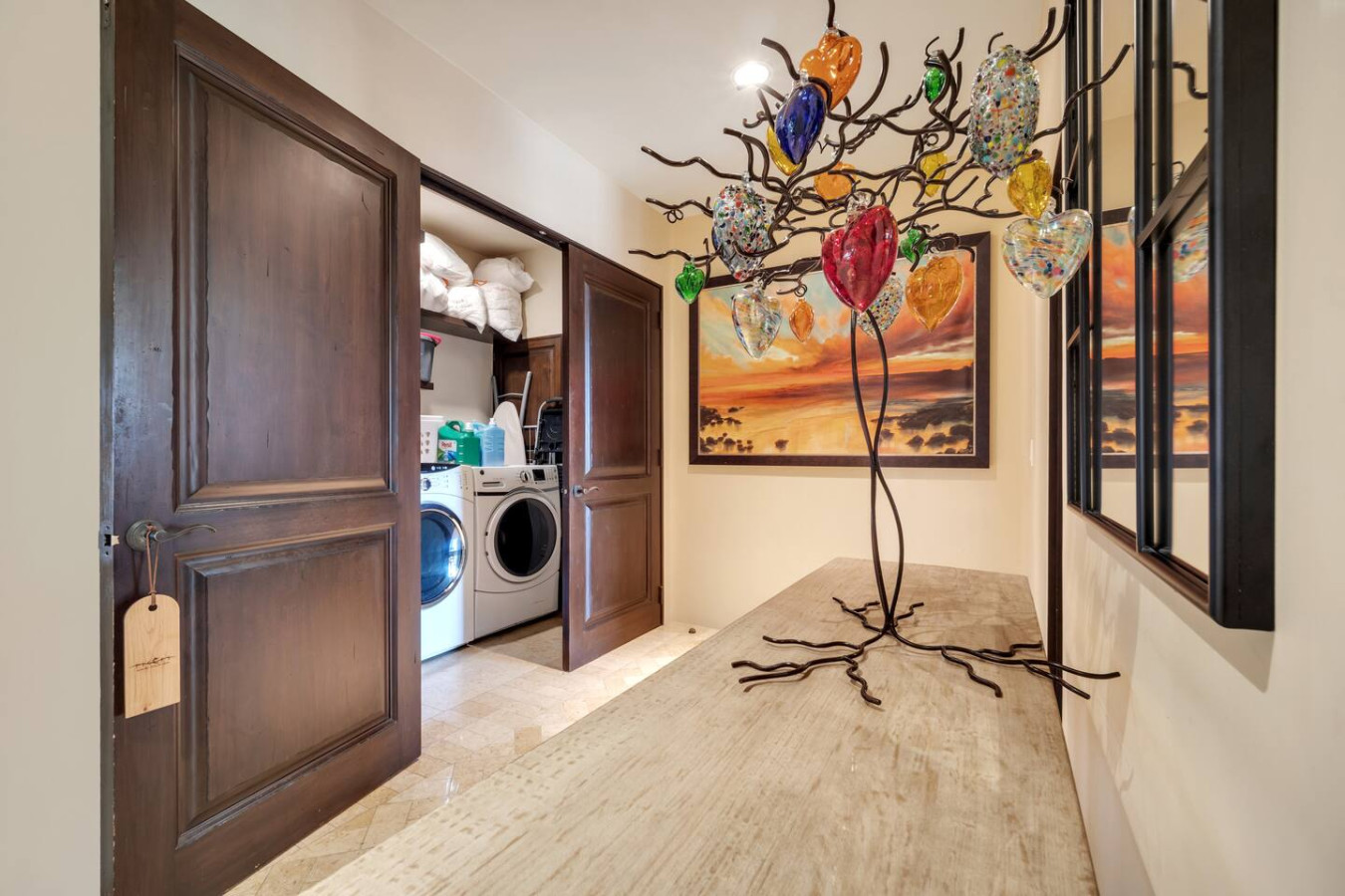 Adjacent to the living room, there is a dining table for six, and following immediately, a luxurious granite island, ideal for an early cup of coffee or a light breakfast. The island complements the residence’s gourmet kitchen, which is fully-stocked with state-of-the-art appliances. There is a laundry room with washer and dryer.