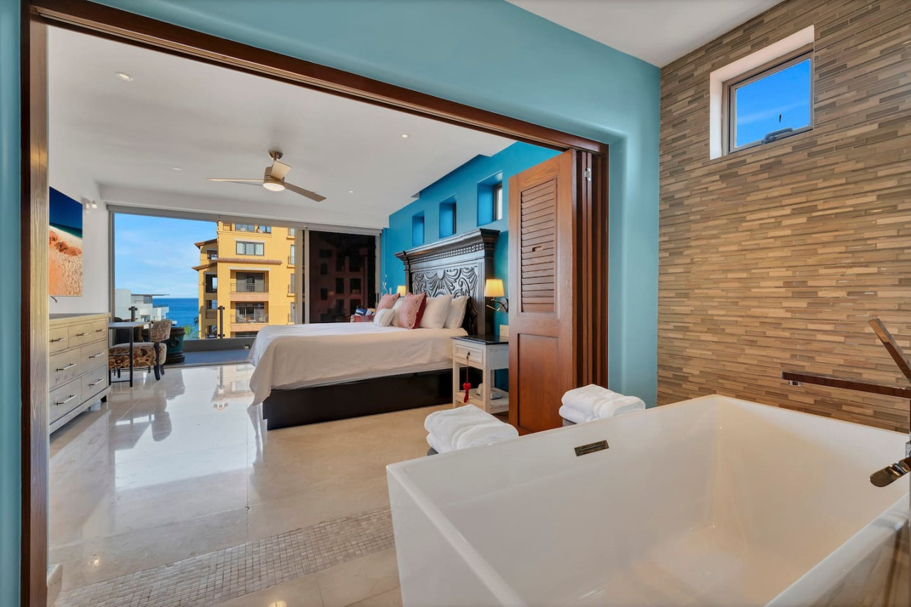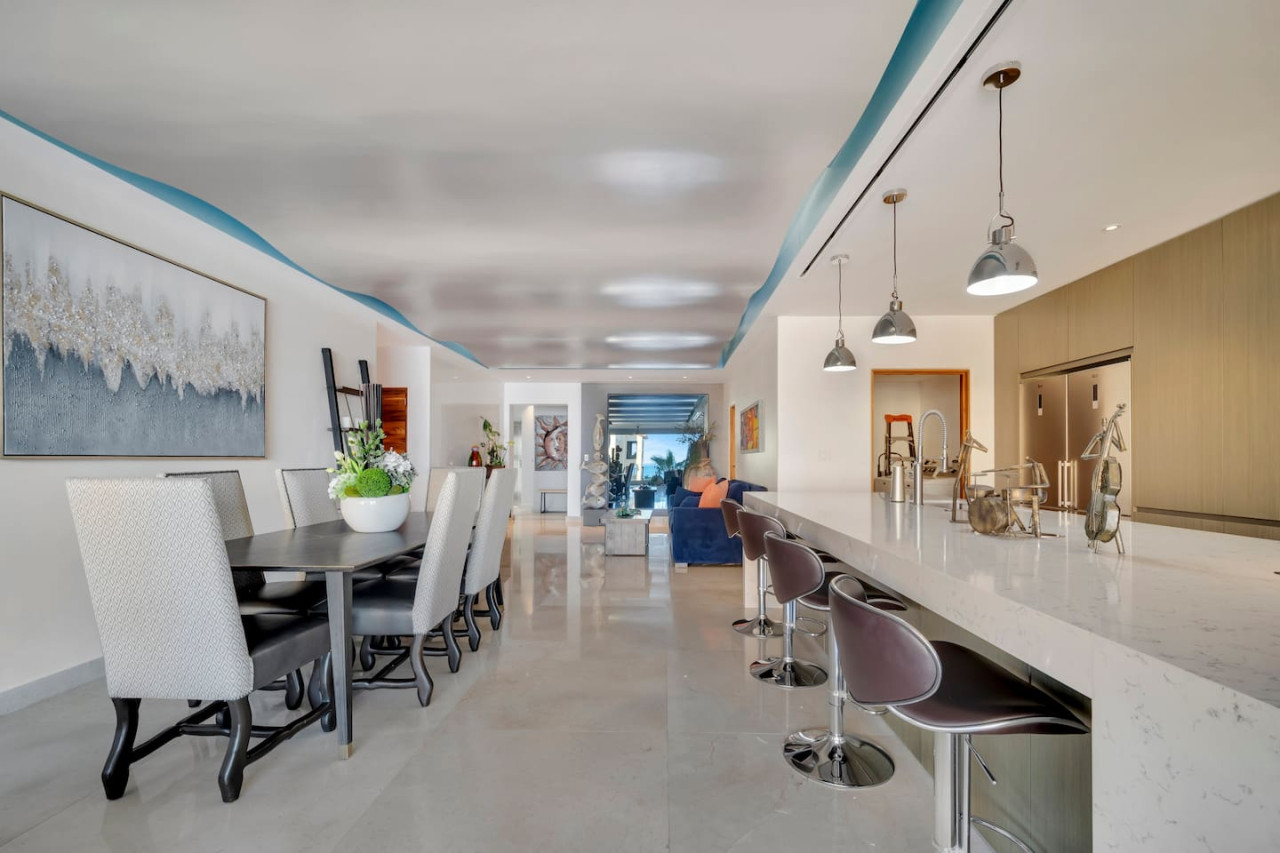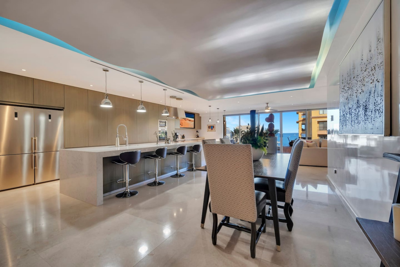 This newly remodeled 3BD/2.5BA 4th floor Penthouse style condo at One Medano Beach Resort is located 200 Meters from the best swimming beach in Cabo (Medano Beach) and across the street from the Puerto Paraiso Mall which is home to world class shops and restaurants. It is one block from the Marina and walking distance to everything in town. Just a short walk around the neighborhood you will find many grocery stores, restaurants, bars and a ton of beach activities.